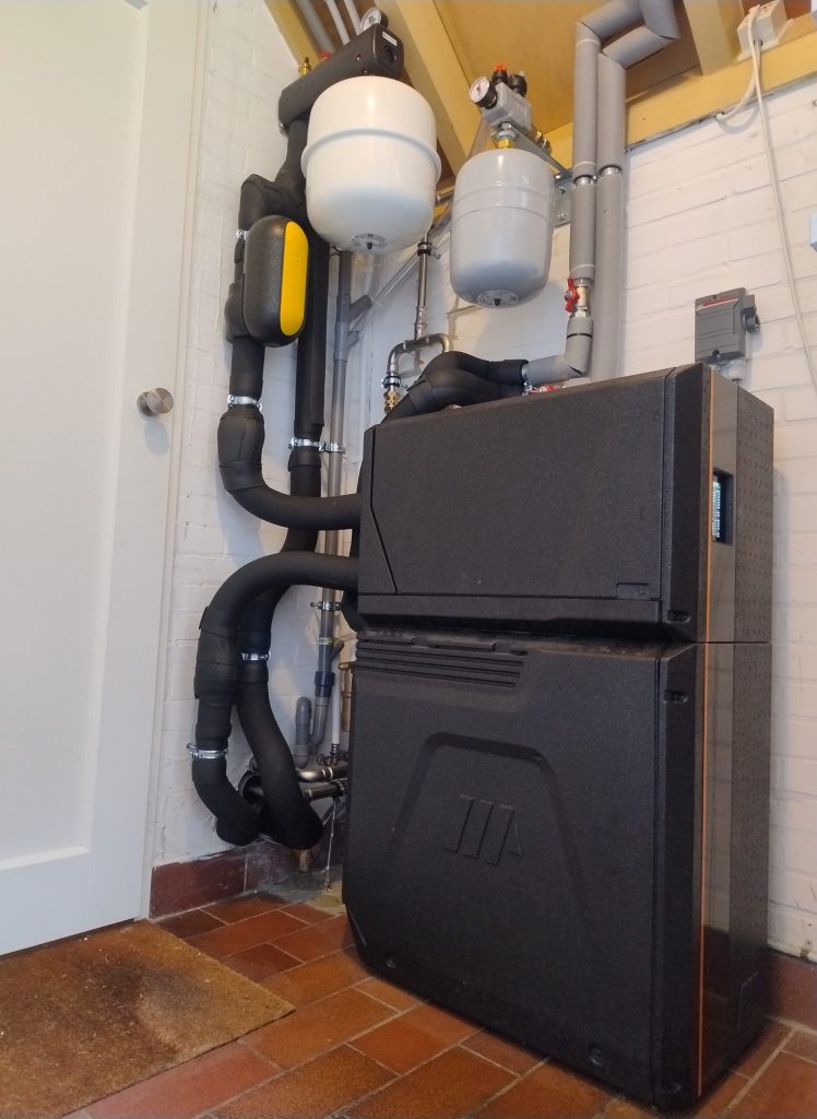De nieuwe Triple Solar PVT-warmtepomp 5. Hierboven afgebeeld met leidingen naar de bovenverdieping waar een knieschot warm tapwatervat ligt van 300L. Gasloos.