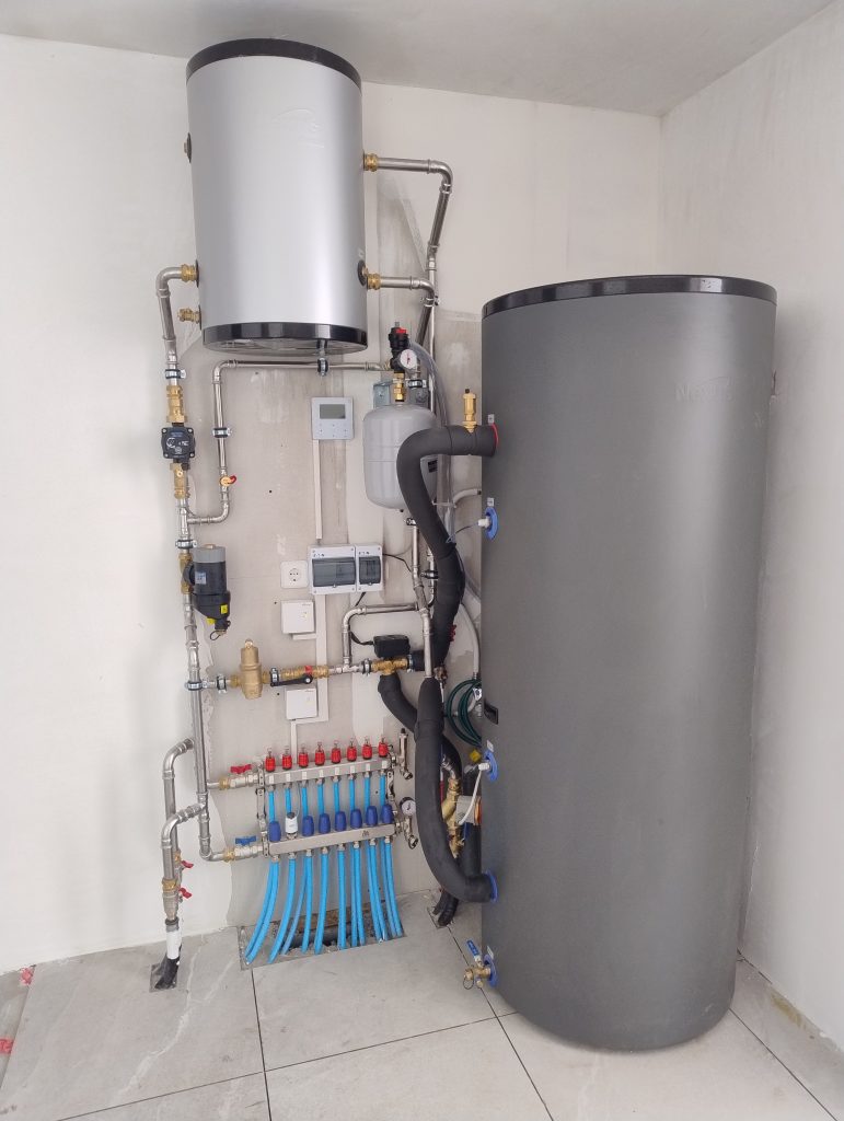 De binnen installatie van een lucht/water warmtepomp. Hierboven is gekozen voor een 500L warm tapwatervat.
